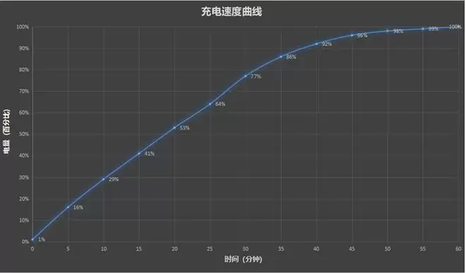充电曲线如图所示。5分钟充入16%,10分钟充入29%,20分钟充入53%,半小时充入77%。
