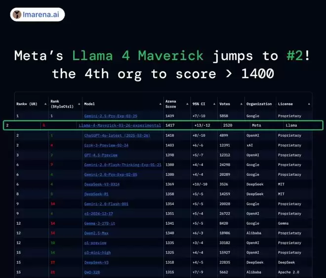 这场分裂的伏笔,最早可以追溯到 2025 年 4 月 Meta 发布的 Llama 4 系列模型。当时,Meta 推出了一款代号为“Maverick”的模型版本,该模型在行业内最具权威的 Chatbot Arena(聊天机器人竞技场)排行榜上一鸣惊人,以 1,417 分的成绩高居第二,一度压倒了当时的行业标杆 GPT-4o。