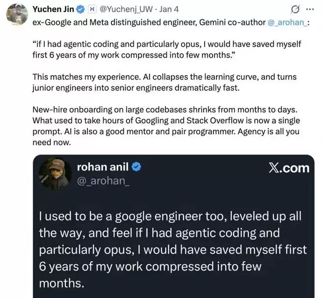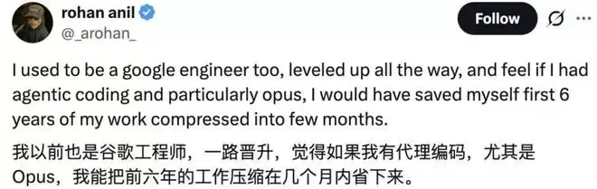 其中,一位名为 Rohan Anil 的 X 网友评论道:自己以前也是谷歌工程师,在职期间一路晋升,但如果当时就有 Agent coding 的话,尤其是 Opus,也许就能把前六年的工作压缩在几个月内完成。
