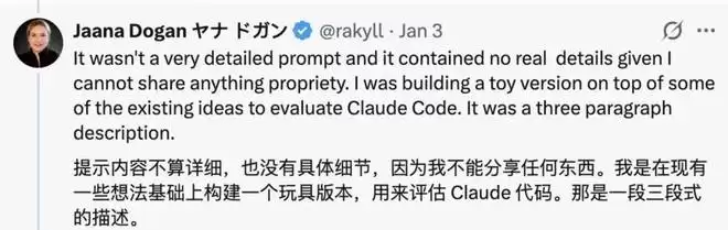 随后,她又发文补充,提示内容不算详细,也没有具体细节,只是一段三段式的描述。但由于不能分享任何东西,也不好具体展示出来,总结来说就是在现有一些想法基础上构建一个玩具版本,用以评估 Claude Code。