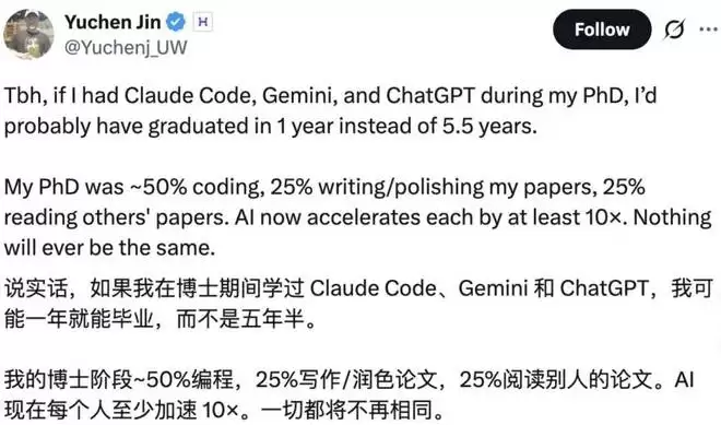 近日,X 知名博主、Hyperbolic 联创 & CEO Yuchen Jin 发帖称,如果在他读博士的时候就有 Claude Code、Gemini 和 ChatGPT 等各类 AI 工具出现,那么也许只要一年就能毕业,而不是用了 5.5 年。