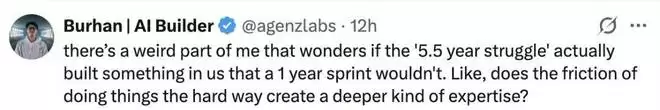 网友 Burhan 甚至觉得那些曾经「浪费」的时间让自己成长了。他内心深处开始思考一个问题:这「5 年半的挣扎」是否真的在我们身上构建了一些「1 年冲刺」所无法带来的东西。换句话说,这种用「笨办法」死磕硬磨所带来的阻力,是否反而锻造出了一种更深层的专业造诣?