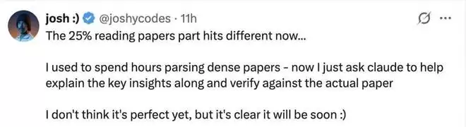有网友认为,就像 Yuchen Jin 所言,博士期间约有 25% 的时间是用来阅读大量论文的,但 AI 的出现让这一部分变得不一样了。「我以前需要花几个小时来解析晦涩的论文,而现在只要请 Claude 帮忙解释关键见解,并对照实际论文进行验证就可以了。」