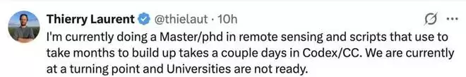 网友 Thierry Laurent 也持相似看法,他说自己目前正在攻读遥感硕士学位,以往需要几个月才能积累的脚本素材,现在在 Codex/CC 里只需要几天时间就可以了。「我们目前正处于一个转折点,但大学尚未准备好。」