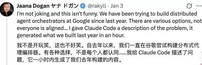 先是谷歌首席工程师、Gemini API 负责人 Jaana Dogan 在 X 上发文称:「我不是在开玩笑,这也不好笑。从去年开始,我们就在谷歌内部尝试构建分布式 Agent 编排器。有多种选择,大家并没有完全认同……我只是向 Claude Code 描述了问题,它就在一小时内生成了一个东西,而这几乎就是我们去年一年所做的东西。」