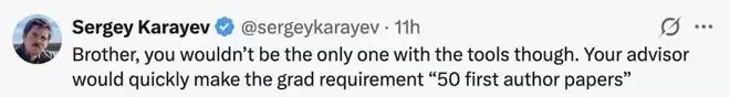 还有网友调侃称,「兄弟,不过别忘了,你不是唯一有AI工具的人,也许你的导师很快就会把研究生要求定为:需要50篇第一作者论文。」