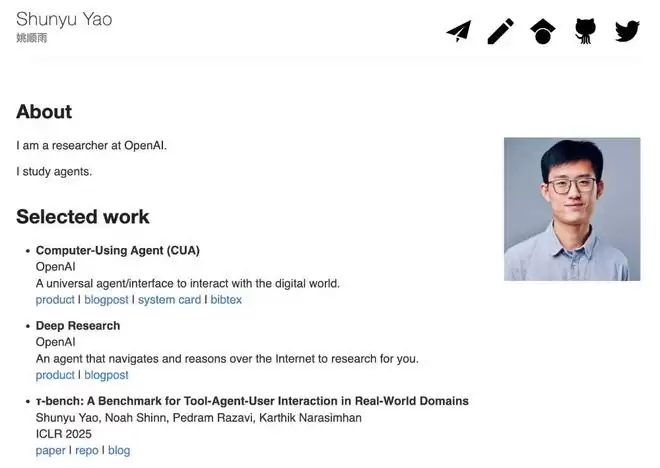 2024年博士毕业后,他加入OpenAI,主要研究智能体方向,在OpenAI研究用于数字自动化(WebShop、SWE-bench、tau-bench)的语言智能体,相关成果包括ReAct、Reflexion、思维树、SWE-agent、CoALA等,学术成果总引用超20536次。