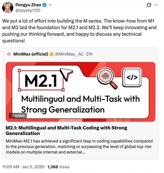 今天,MiniMax开源新模型M2.1,该模型专门针对代理场景优化。赵鹏宇在X上转发最新推文,并称“我们在M系列产品的研发上投入了大量精力。M1和M2的经验为M2.1和M2.2的研发奠定了基础。我们将继续创新,不断突破,并乐于解答任何技术问题!”