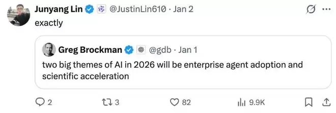 2026年1月2日,林俊旸在海外社交媒体X上转发了OpenAI联合创始人Greg Brockman的推文,并配文“exactly”,认同Greg Brockman所说:2026年人工智能的两大主题将是企业智能体的应用和科学加速。