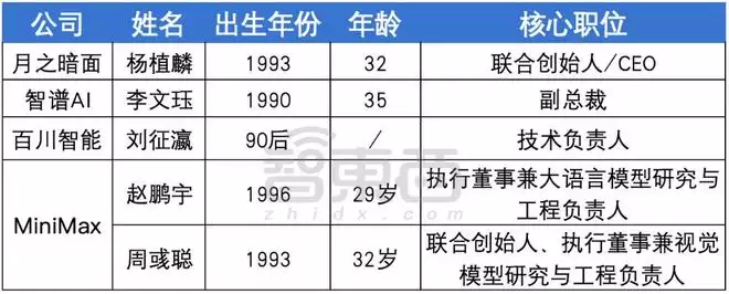 在前列国产AI大模型企业中,90后AI技术领头人则至少占据5席。除MiniMax的赵鹏宇外,月之暗面创始人兼CEO杨植麟,更是国产AI独角兽企业中最年轻的CEO之一。