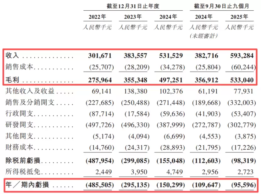 2024年、2025年1-9月(报告期),公司的收入分别为3.2亿元、5.93亿元,毛利率分别为91.5%、89.8%。
