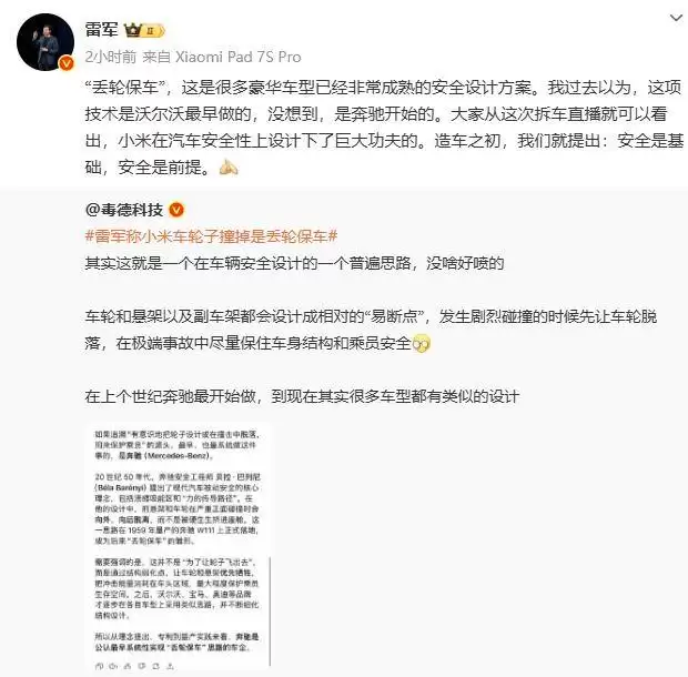 针对这一质疑,小米集团创始人、董事长兼CEO雷军在个人微博作出回应。他表示,“丢轮保车”并非小米汽车独创,而是许多豪华车型早已应用且成熟的安全设计方案。雷军提到,自己原本以为这项技术最早由沃尔沃推出,经了解后发现是奔驰率先采用。