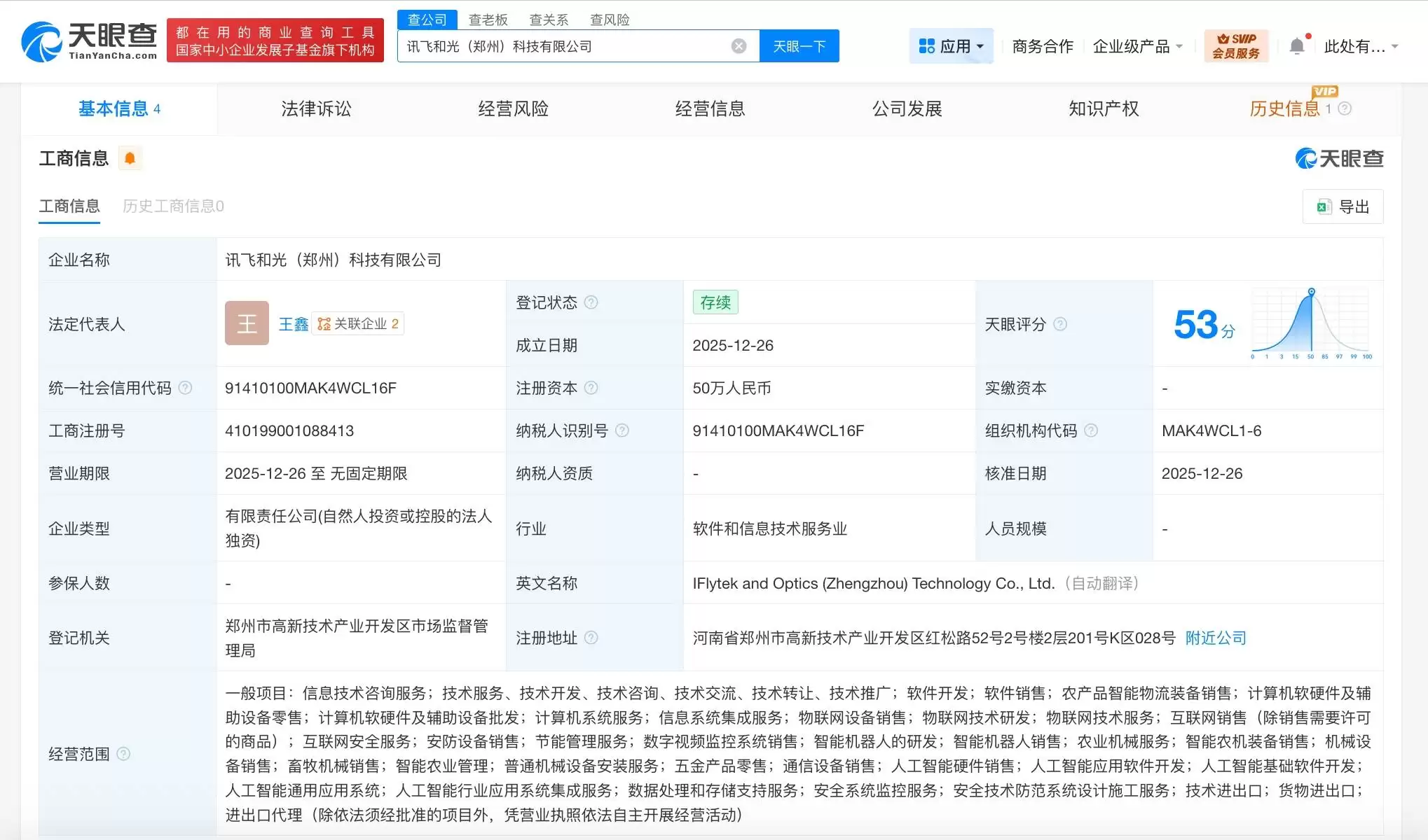 根据公开工商信息平台显示,一家名为讯飞和光(郑州)科技有限公司的新企业近日完成注册登记。该公司法定代表人系王鑫,注册资本为50万元人民币,注册地址位于河南省郑州市。