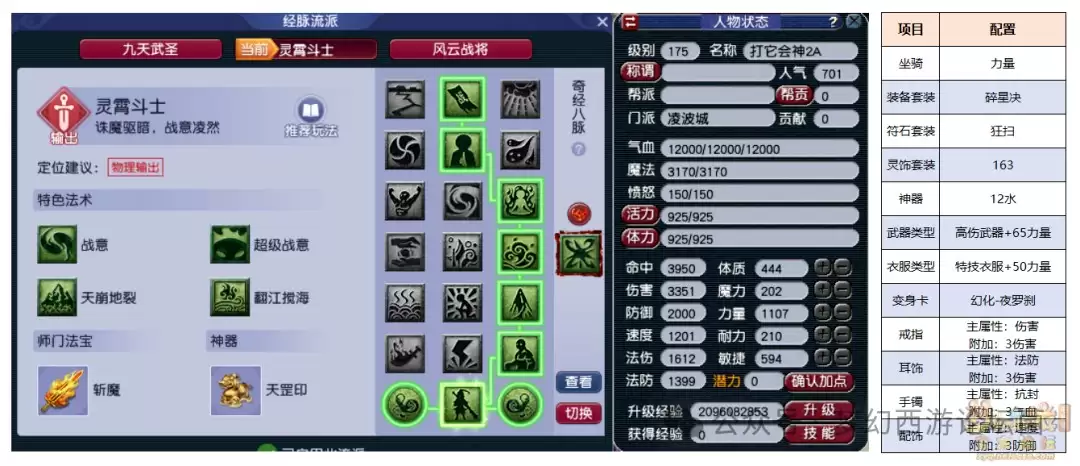 梦幻西游175帮战狮驼岭装备搭配 今天咱们来聊聊一个经典话题:175级的狮驼岭,在区内帮战中该如何武装自己。一个比较主流的配置思路,是12+6左右的硬件,再搭配上愤怒腰带和三个核心特技,这套组合拳打下来,在帮战舞台上已经相当有竞争力了。 上面这张图展示的,就是一个典型的175狮驼岭在不打临时符时的面