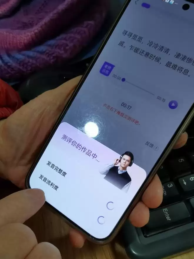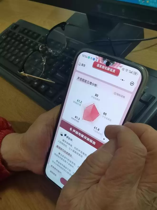 当过语文老师的她,尝试理解词中韵味。练声题里的两首宋词,一婉约一豪放,“寻觅”“梦回”放在一起恰似一个人的起起伏伏。再读“了却君王天下事……可怜白发生”,她降低了语速,在“怜”字后加了个停顿,“白”字加了重音。几秒后,AI弹出测评结果:三颗星。