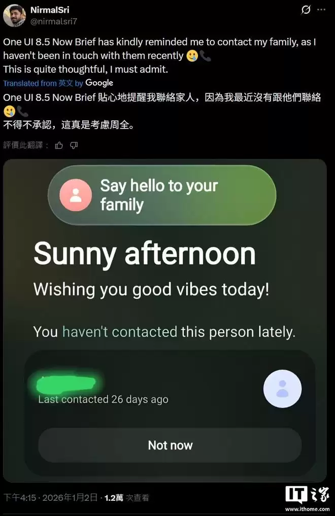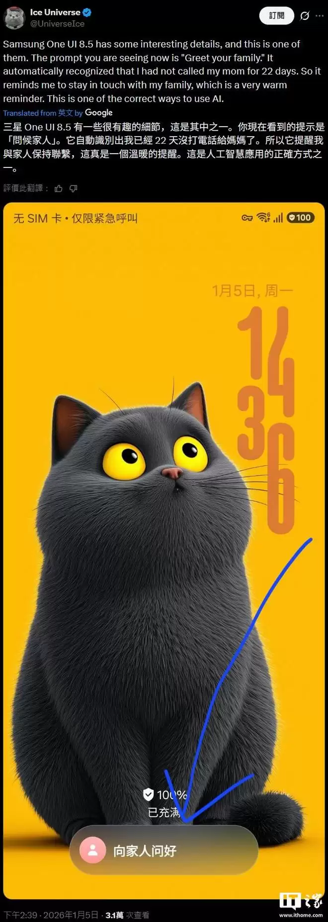 IT之家 1 月 5 日消息,消息人士 NirmalSri 本周(1 月 2 日)在 X 平台曝光三星 One UI 8 5 系统的“向家人问好”功能。据介绍,这项功能隶属于“Now Brief”(