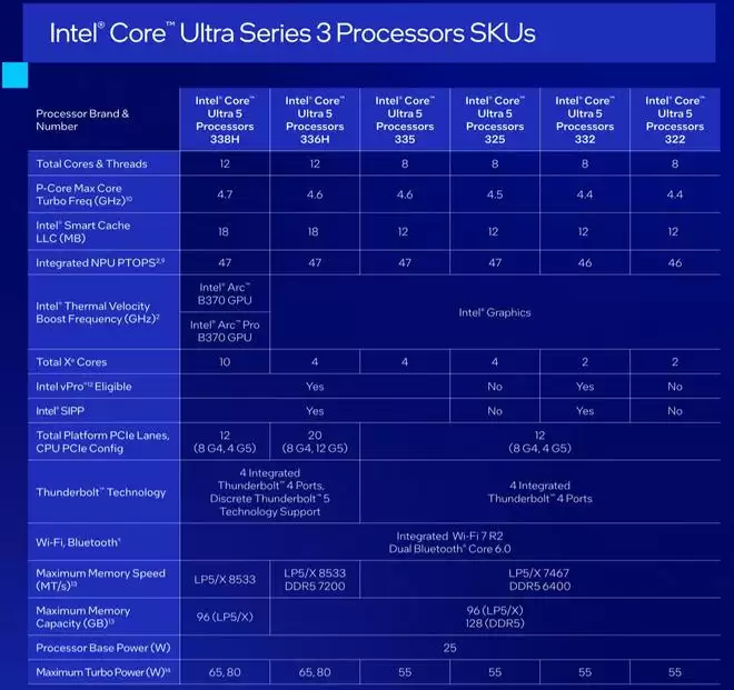 在酷睿 Ultra 5 产品线中,多数型号同样取消了 H 后缀,转向更低功耗与 8 核心配置。其中,Ultra 5 338H 虽未采用 X 系列命名,但同样集成了 Arc B370 GPU,配备 10 个 Xe3 核心。