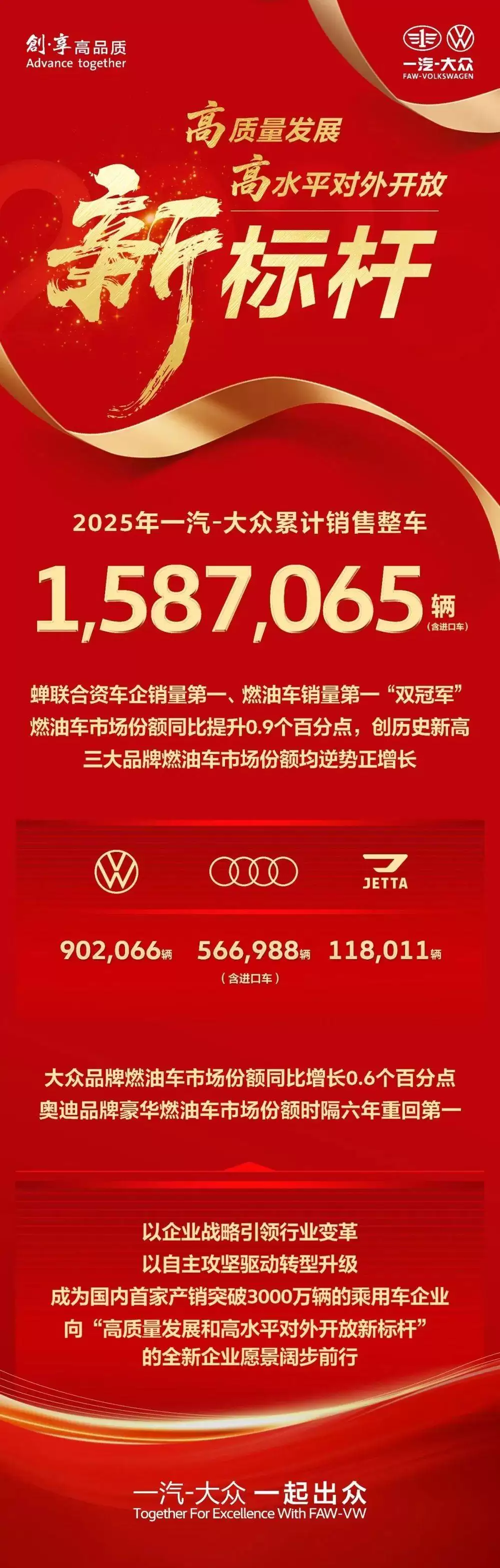 当汽车行业正处于深度变革之中,新能源渗透率持续攀升,一汽-大众凭借其成体系的竞争优势与战略定力,在2025年交出了一份高质量的发展答卷。公司全年整车销量达到1,587,065辆(含进口车),其中大众品牌贡献902,066辆,奥迪品牌销售566,988辆(含进口车),捷达品牌交付118,011辆,不仅蝉联合资车企销量冠军,也再次问鼎燃油车市场销量榜首。面对日益加剧的市场分化挑战,一汽-大众燃油车市场份额逆势增长0.9个百分点,三大品牌燃油车份额均实现了正向增长,奥迪品牌更是在时隔六年之后,重新夺回了豪华车市场燃油车份额第一的桂冠。
