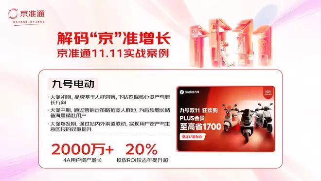 实现增长的还有九号电动品牌。2025年京东11.11期间,九号电动继续冲刺新高峰,品牌京东最新旗舰店达成4A用户资产增长超千万,投放ROI较去年有了大幅提升。