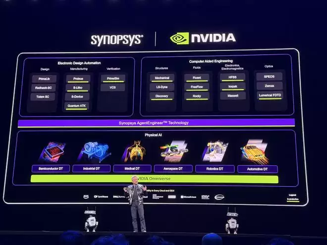 工业制造是物理AI的另一核心战场。黄仁勋宣布了与西门子深化合作,将英伟达的物理AI模型、Omniverse仿真平台集成至西门子的工业软件组合,覆盖从芯片设计、工厂模拟到生产运营的全生命周期。