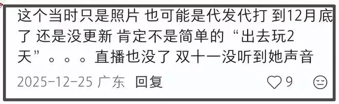 直播带货每年最赚钱的时间就是双十一和年尾的清货,李金铭直接放大假,也让网友充满了疑惑,有网友称绝对不是简单的“出去玩2天”。按照圈内多位女星一怀孕就消失的情况来看,李金铭的状况实在太类似,比如才刚官宣宝宝的何穗,就休息了很久。85年出生的李金铭40岁了,如若真的怀孕,那么休息也是正常的,毕竟也算大龄产妇了,身体最重要。