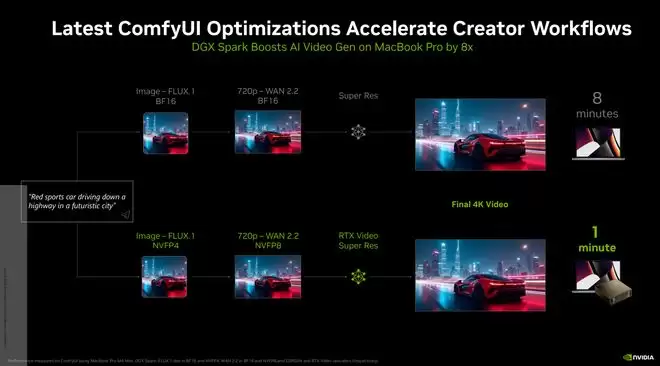 在实际应用场景中,DGX Spark展现了惊人的性能优势:在运行Black Forest Labs的FLUX.2等视频生成模型时,其速度比搭载M4 Max芯片的顶配MacBook Pro快了足足8倍。