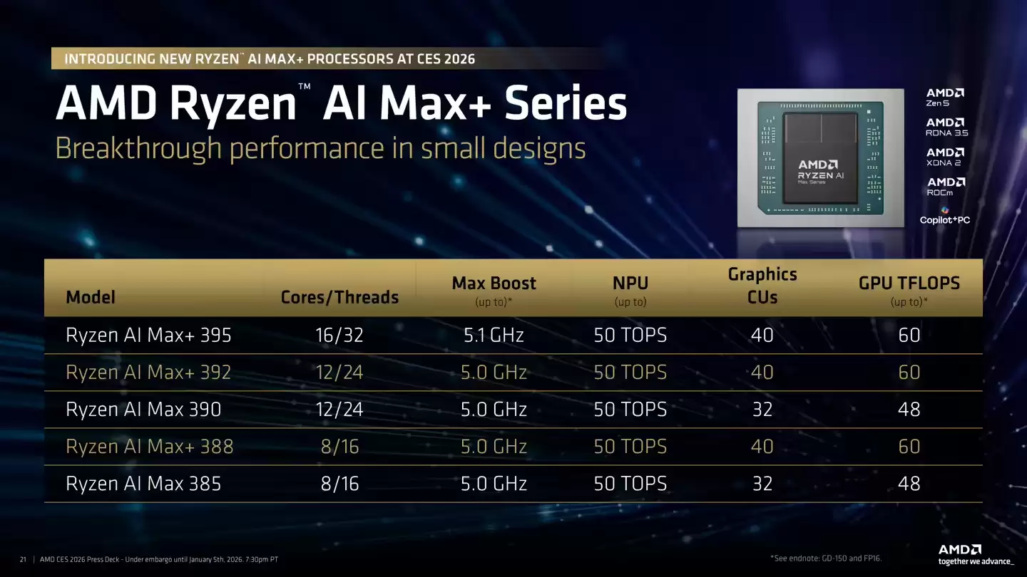 针对高端工作站领域,AMD此次还扩充了其备受瞩目的Ryzen AI Max+系列移动处理器,新增了12核心的Max+ 392和8核心的Max+ 388两款型号。这两款芯片采用了独特的类APU系统级芯片(SoC)设计,支持高达192GB的共享内存。