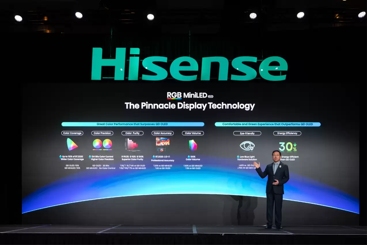为了打破传统Mini LED和OLED技术在色彩呈现、能效及视觉舒适度方面的现有局限,进一步改善大屏时代显示设备的用户体验,海信在一年前创新性地开创并实现了全球首款RGB-Mini LED电视的量产。这项创新技术随后吸引了全球TOP5电视品牌的广泛布局,迅速成为高端电视领域的一大趋势热词。“RGB与Mini LED的结合,无疑是一场颠覆性的变革。”海信视像科技总裁李煊在今年CES的展前发布会上表示。为了实现那份无限趋近于人眼所见的极致真实,全新一代RGB-Mini LED技术带来了三大关键维度的进化。