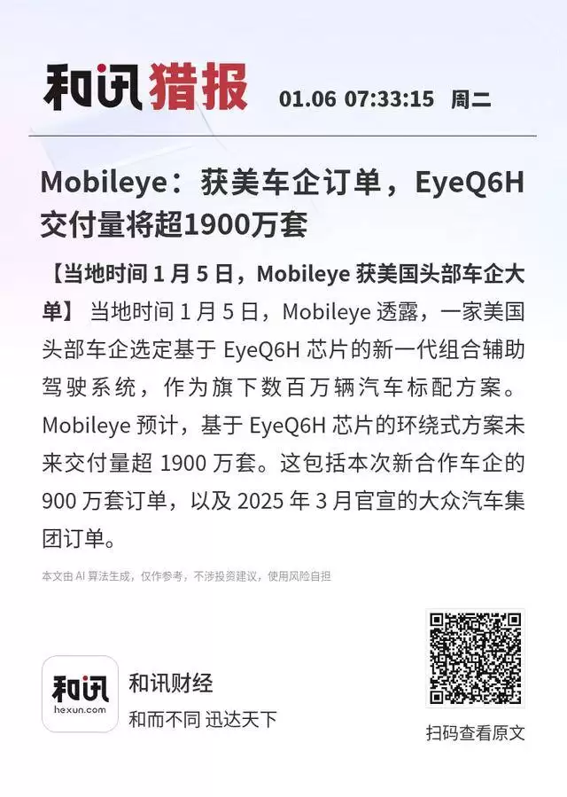 Mobileye再获EyeQ6H大单:助美车企迈向1900万套交付里程碑