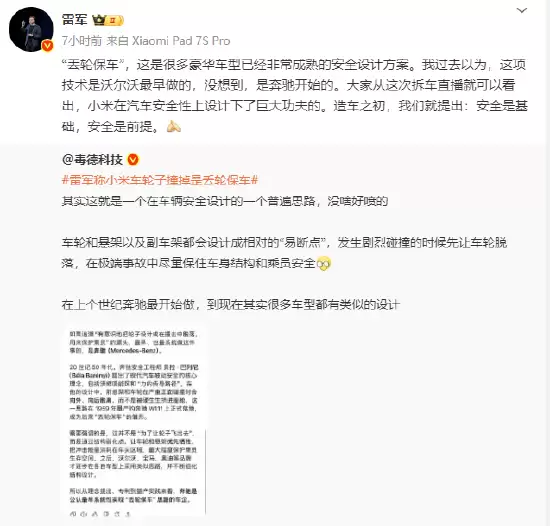 雷军的解释引发了广泛关注,许多网友表示对小米汽车的安全性有了更深入的理解。有业内人士指出,随着汽车安全技术的不断发展,类似"丢轮保车"的设计将越来越常见,成为保障行车安全的重要手段。