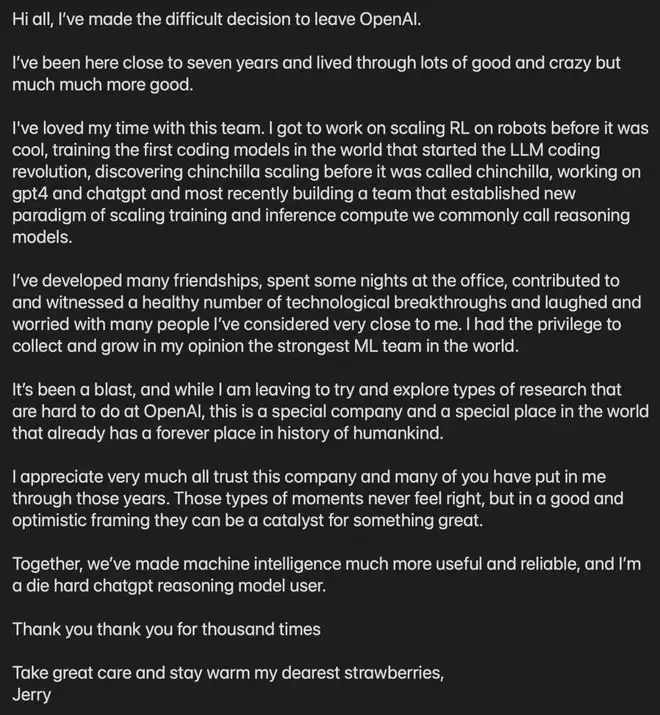 然而,就是这样一位「开国功臣」级别的人物,选择在2026年的第一个周末,用一封内部备忘录,为自己的OpenAI生涯画上了句号。