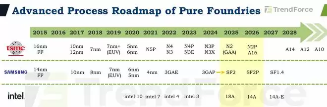 全球半导体先进制程的角逐已挺进2纳米关口,赛道上仅剩台积电、三星与英特尔三足鼎立。集邦咨询(TrendForce)报告显示,三大巨头的技术迭代将在今年进一步提速:台积电继去年底切入2纳米后,今年将向N2P及A16制程演进;三星计划将SF2升级至SF2P;而英特尔在落地18A的同时,已开始向下一代14A节点发起冲击。