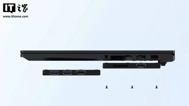 据悉,这款笔记本最终将被命名为“SCHENKER ELEMENT 16”。其半模块化的设计旨在延长产品使用寿命并提升环保可持续性。机身左右两侧的I/O接口模块、电池、散热风扇、硬盘、内存均可自行拆卸更换。同时,其D面底壳采用了免螺丝的快拆架构,方便用户快速清灰或升级配置。