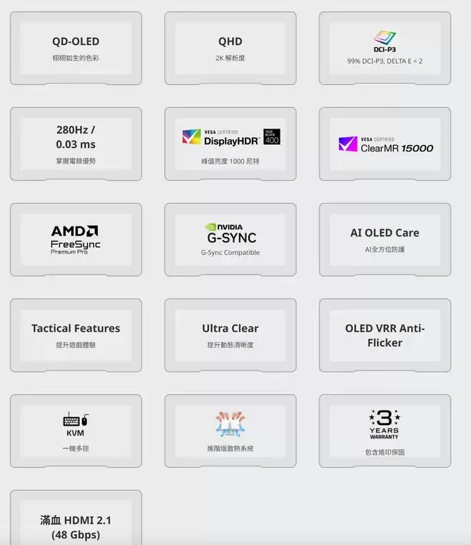 这款显示器采用通体白色设计,专为打造白色主题桌搭的玩家准备。它配备一块27英寸OLED面板,最高刷新率为280Hz,分辨率为2560 x 1440 (2K)。它拥有HDMI 2.1接口,通过HDR True Black 400认证,并支持英伟达G-Sync同步技术。