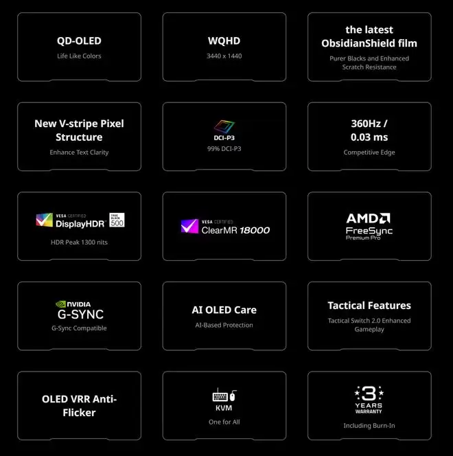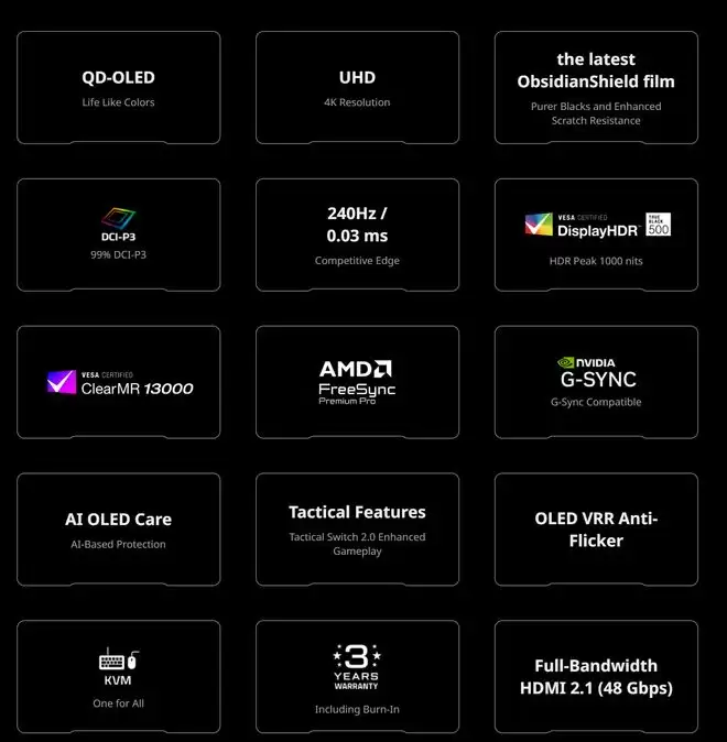 该显示器采用32英寸QD-OLED面板,为常见的16:9宽屏比例设计,分辨率达到3840 x 2160 (4K),最高刷新率为240Hz。屏幕表面覆盖了曜石护盾膜(ObsidianShield Film),有助于减少OLED面板常见的紫色偏色问题,同时增强了防刮擦能力。