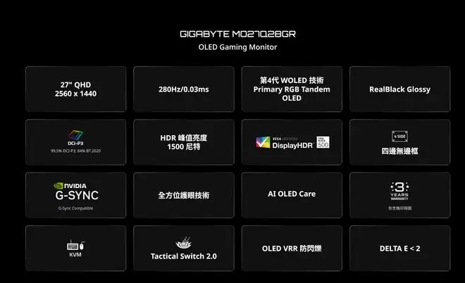这款显示器已于去年末上市,它搭载27英寸RealBlack Glossy WOLED面板,分辨率为2560 x 1440 (2K),最高刷新率可达280Hz。其通过了HDR True Black 500认证,峰值亮度高达1500尼特,支持VESA 100x100mm标准壁挂。设备内置双5W扬声器,目前参考售价为3399元。
