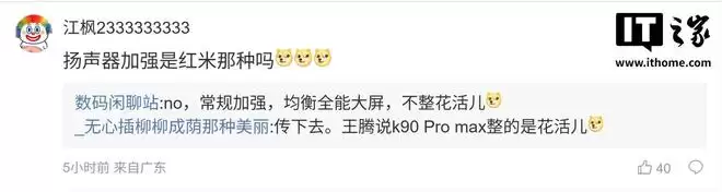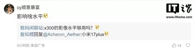 后续有用户在评论区询问:「扬声器加强是红米那种吗?」,博主回复道:「不是,是常规的立体声加强。这款是均衡向的全能大屏,不搞那些花哨的噱头。」另一名用户则追问:「影像啥水平?(IT之家注:原文“影响”为笔误,正字为“影像”)」,博主回应称:「x300 级别的影像水准够用吗?」
