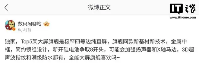 1月6日,科技资讯平台IT之家引述爆料消息称,知名博主@数码闲聊站 今日通过微博透露,某头部厂商的一款大屏旗舰新机将搭载极窄四等边纯直屏。