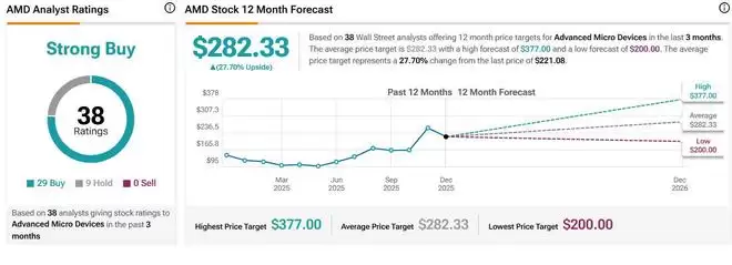 TIPRANKS汇编的华尔街分析师平均目标价显示,分析师们对于AMD的平均目标价预期高达282.33美元,意味着未来12个月内潜在涨幅至少高达28%,最高目标股价则为知名投资机构Raymond James首次覆盖AMD股票即给出的高达377美元这一牛市目标价。