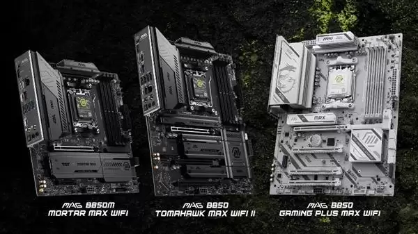 微星全新的B850 MAX产品线则包括三款型号:MAG B850 TOMAHAWK MAX WIFI II战斧导弹、微ATX版型的MAG B850M MORTAR MAX WIFI迫击炮、全白色款MAG B850 GAMING PLUS MAX WIFI。