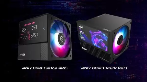 这是微星全新设计的双塔风冷散热器系列,将散热设计与智能显示屏集成相结合,其中MPG COREFROZR AP15集成一个数显屏,可提供实时系统信息,便于快速、直观的监控。