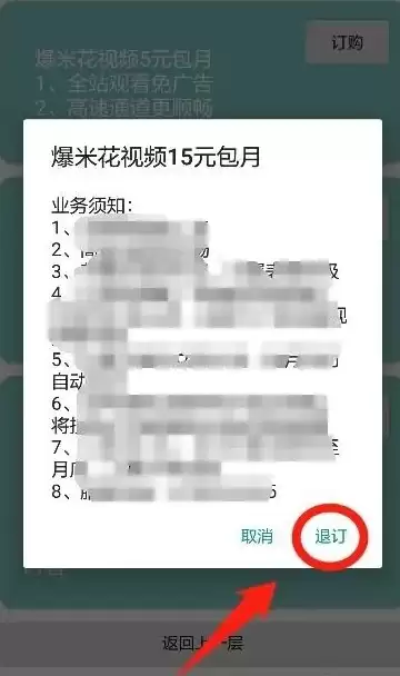 页面会立即跳转至“会员商城”界面,找到已购买的“爆米花视频15元包月”商品,并点击“已订购”按钮。接着会弹出退订须知,点击“退订”即可完成操作。