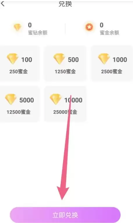 进入兑换页面后,根据您的需求选择合适的蜜金数量,然后点击"立即兑换"按钮确认操作,具体操作方式可参考下图箭头指示