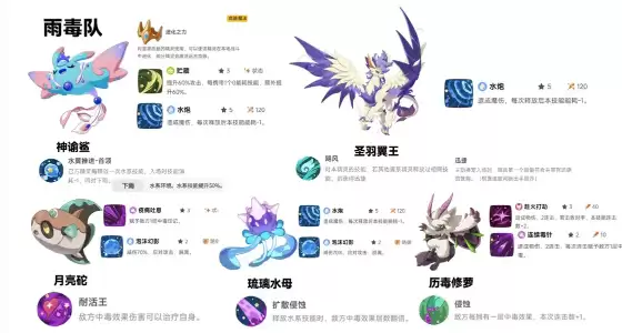 除了雨天泥沼队之外,玩家也可以关注一下雨毒队。在雨天队的基础上,可以增加中毒的机制,拥有比较出色的容错率。核心的思路是首领化之后就会触发下雨的效果,可以先给敌方挂上中毒印记,接着琉璃水母就可以有效释放水系技能,让敌人的中毒层数翻倍。接着圣羽翼王靠着迅捷的技能就能有效补充伤害,这一套阵容不仅雨天的水系伤害加成可以提升,还会有持续中毒的伤害。面对肉盾阵容,也可以慢慢去磨,打起来真的还是比较稳的。