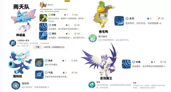 雨天队的配置主要围绕精灵下雨效果展开。除了彩蝶鲨,卷毛鸭也成为主要的输出点。水刃在水系环境中,威力直接翻倍,应对状态时,能耗可以减少4点,配合雨天 buff 就能直接造成爆炸伤害。圣羽翼王虽然是异系,但可以学习水系技能水泡。其主要特性是飓风,比较适合这一套阵容。其他精灵在放完相同技能之后,就可以获得迅捷。更换宠物入场时就能释放符合能量要求的技能,收割残血的效率还是比较高的。然后搭配润泽技能,可以提升魔法攻击,整套阵容简单粗暴,靠着高爆发就能打出伤害,不过缺点是容错率相对比较低。
