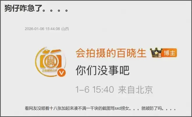 咱不知道,但放心,哥哥们应该还能苟。起码狗仔这边是没料了,要不然也不能盯着司晓迪。