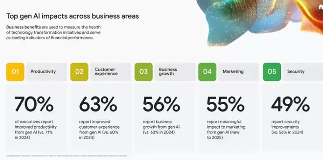 在考量AI投资回报时,企业关注的焦点已高度集中在具体业务指标的改善上。报告显示,生产力提升、客户体验优化、业务增长、市场营销及安全运营成为当前AI变现的五大核心领域。