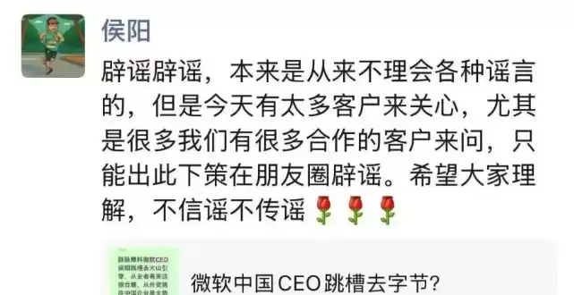 1月5日,有消息称微软全球资深副总裁,微软大中华区董事长兼首席执行官侯阳,已跳槽去字节火山引擎团队。针对该传闻,侯阳通过朋友圈发文辟谣,明确表示传闻不实。他表示,“本来是从来不理会各种谣言的,但是今天有太多客户来关心,尤其是很多我们有很多合作的客户来问,只能出此下策在朋友圈辟谣。”同时,侯阳呼吁大家不信谣不传谣。