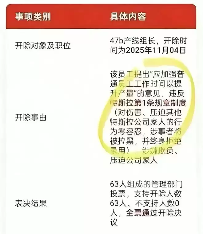 据了解,事件发生在2025年11月4日,当时正值特斯拉上海超级工厂订单高峰期。这名47号产线组长提出延长工时的建议,但被公司认定违反了特斯拉第 1 条规章制度(对伤害、压迫其他特斯拉公司家人的行为零容忍,涉事者将被拉黑,并终身拒绝录用),涉嫌欺负、压迫公司家人。公司内部文件显示,处理决定经管理部门集体投票,63人支持开除,0人反对。涉事组长被立即开除,且被列入公司黑名单,终身拒绝录用。