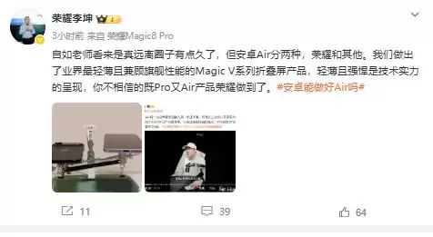 1月5日,荣耀旗舰手机产品经理李坤发文,正面回应王自如“不相信安卓能做出比苹果更好的Air” 的言论,直言“王自如远离圈子有点久了”。李坤表示,“安卓Air分两种,荣耀和其他。”同时,李坤强调荣耀已做出业界最轻薄且兼顾旗舰性能的Magic V系列折叠屏产品,“既Pro又Air产品荣耀做到了”。